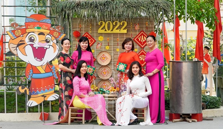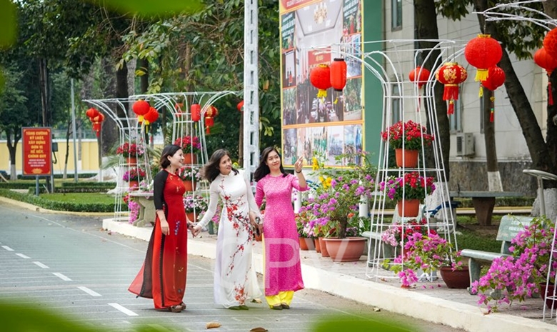 Cán bộ, giảng viên nhà trường trong trang phục truyền thống đón chào năm mới.