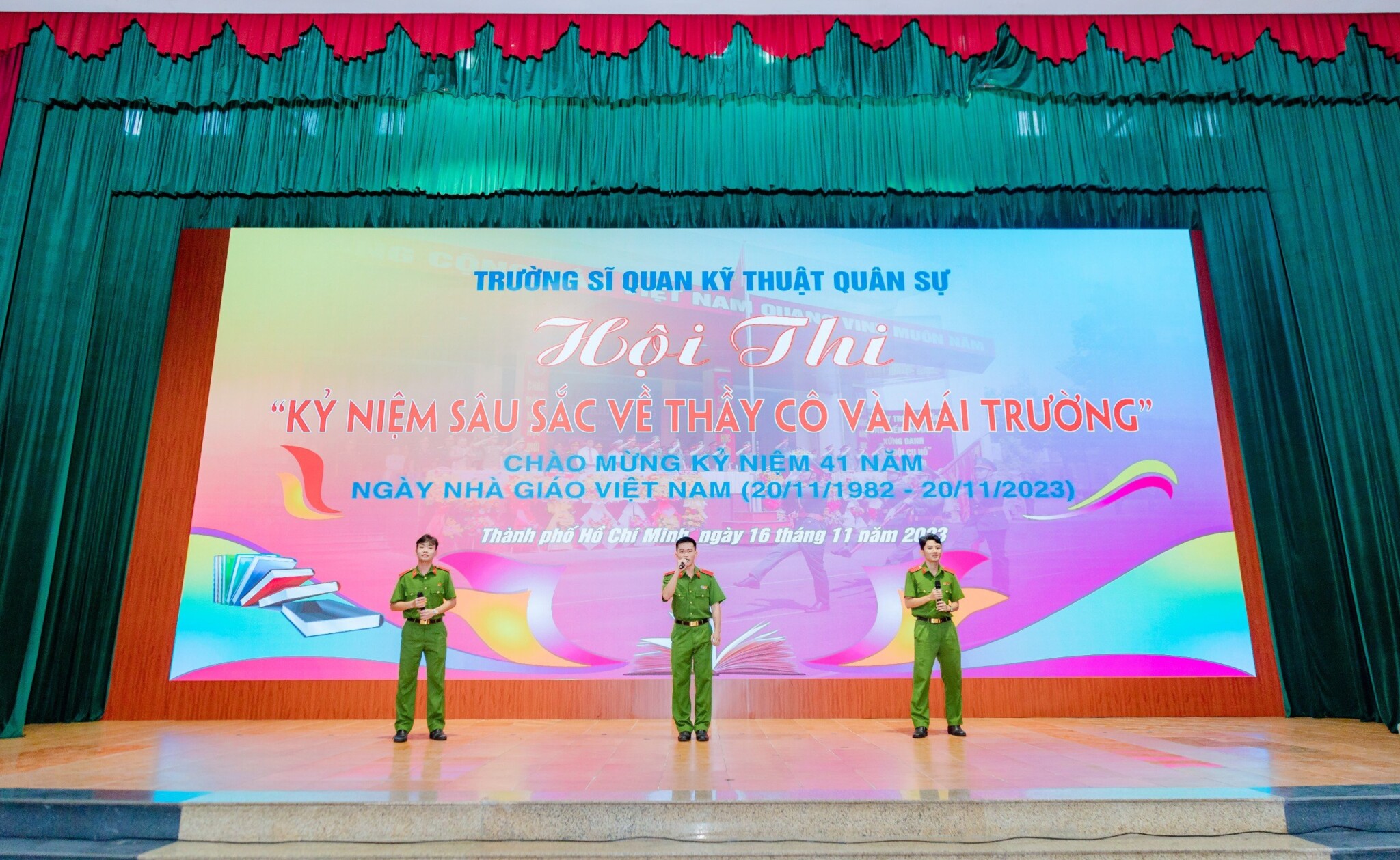 Chiều ngày 16/11/2023, tại Hội trường lớn, Trường Sĩ quan Kỹ thuật quân sự, đã diễn ra Hội thi với chủ đề “Kỷ niệm sâu sắc về thầy cô và mái trường”. Hội thi là một hoạt động trong khuôn khổ kỷ niệm 41 năm ngày Nhà giáo Việt Nam (20/11/1982 – 20/11/2023) và 75 năm ngày thành lập Trường Sĩ quan Kỹ thuật quân sự (15/12/1948 – 15/12/2023).
